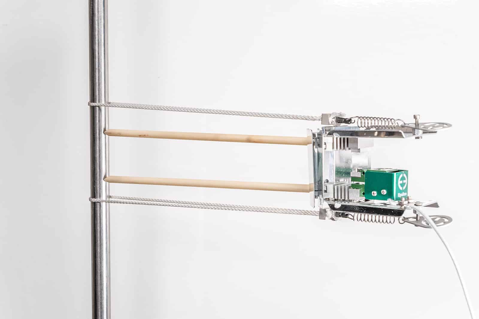 Устройство фиксируется на образце с помощью легких гибких керамических волоконных шнуров. Это позволяет экстензометру самостоятельно удерживаться на образце; кронштейны для крепления экстензометра не требуются. Благодаря самонесущей конструкции и малому весу датчика, боковая нагрузка на испытываемый образец минимизирована. Комбинация радиационных тепловых экранов и конвекционных охлаждающих ребер позволяет использовать данную модель при температурах образца до 1200 °C (2200 °F) без какого-либо охлаждения. Используются стержни из высокочистой оксидно-алюминиевой керамики.
